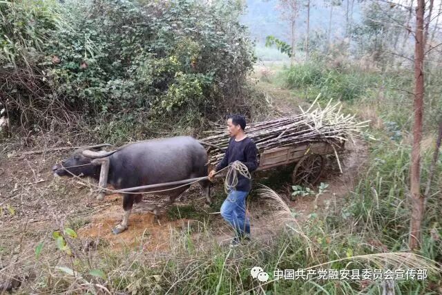1月5日,在融安县沙子乡古益村,一名蔗农使用耕牛运送甘蔗。
