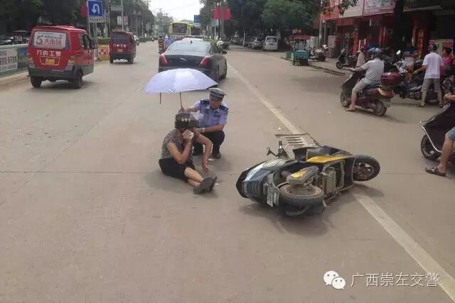 2016年5月10日上午,在龙州县独山路路段,一辆小轿车与两轮电动自行车刚刚发生碰撞,电动自行车的驾驶员倒在路上无法动弹。当时,室外温度高达35摄氏度,夏日阳光照射在身上有种火辣辣的感觉,路面的热气也不断往上冒,由于伤者的伤势不明确不便移动,龙州交警当即到警车拿了雨伞为伤者遮挡热辣的阳光,一边撑伞一边说话鼓励伤者要勇敢坚强,直到十分钟后120医护人员到现场将伤者接走。