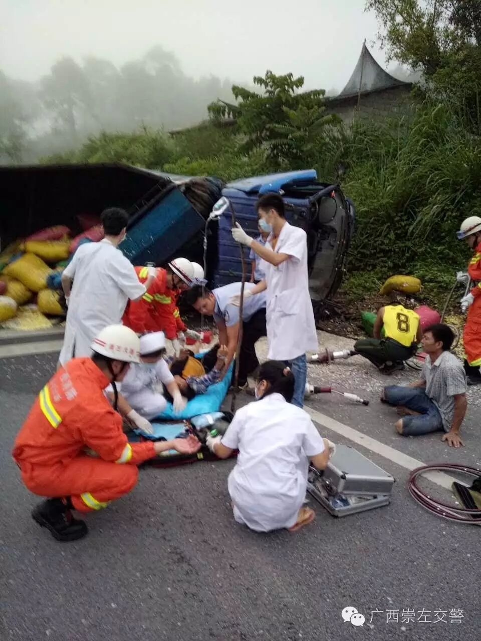 2016年7月7日上午5时07分,在大新县福隆乡平良桥头路段,有一辆车大货车发生侧翻,货车已严重损坏,造成司机和两名乘客被困,大新交警火速赶往现场。有一名司机被挤压在驾驶座位上,伤势较重,救人刻不容缓。在交警与消防官兵的通力合作下,不到20分钟的时间将车内被困人员被救出。医护人员到达后,立马对伤员进行救治,由于现场医疗条件有限,交警协助医护人员,并充当临时吊瓶架。最后这起事故受伤人员均脱离了生命危险。
