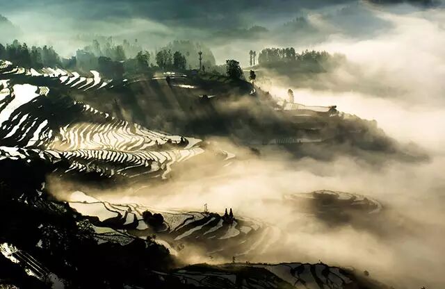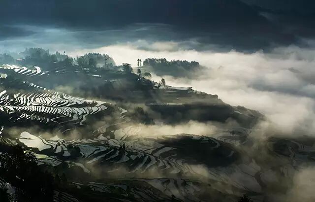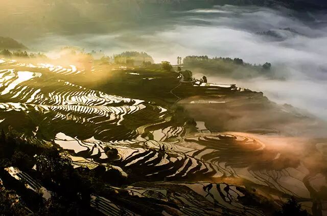 花田梯田位于重庆市酉阳自治县花田乡境内,距县城41公里,梯田处在海拔700——900米的丘陵山坡,面积5平方公里,成片的梯田达上万亩,可与广西龙脊梯田、云南元阳梯田相媲美,是中国民俗摄影创作基地,每年都有大量的摄影爱好者到花田梯田摄影观光,被誉为“深山明珠、人间仙境、画中天堂”。上万亩的梯田层层叠叠的分布于山间,早晨的花田乡云雾翻涌,千变万化,一束束阳光洒向田间,整个梯田笼罩在一片金光之中,仿佛人间仙境。(华龙网签约摄影师 胡云中 摄影)