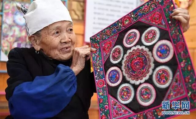 2月22日,在广西三江侗族自治县同乐苗族乡同乐村平溪屯,覃奶时清老人展示一幅侗族刺绣作品。