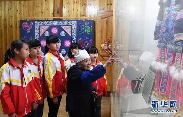 2月22日,在广西三江侗族自治县侗绣博物馆,覃奶时清老人给同乐苗族乡中心小学学生介绍服饰的刺绣手法。