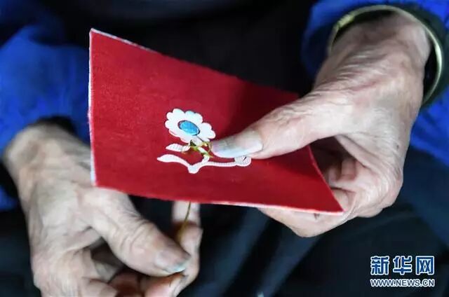 2月22日,在广西三江侗族自治县同乐苗族乡同乐村平溪屯,覃奶时清老人在创作侗族刺绣。