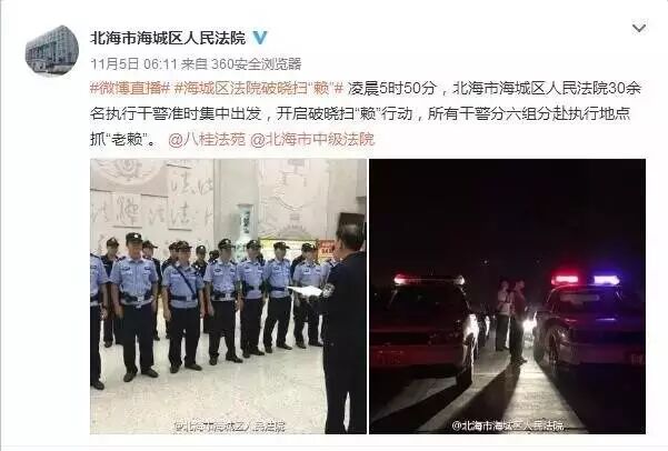 11月5日,凌晨5:30,、10余台车辆集合在审判大楼前,5:50,所有执行干警准时出发,分六组赶赴执行地点开启扫“赖”行动。