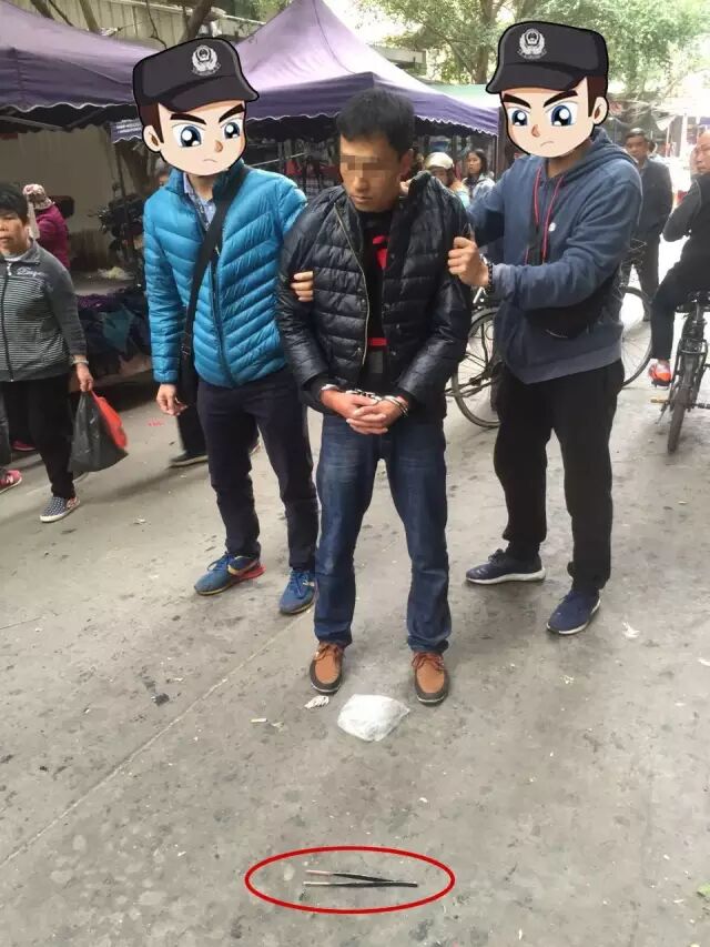 3月7日清晨,寒流刚过,略为上升的气温没为台城带来期望的温暖,空气中仍掺着丝丝的寒意。一名身穿黑色外套蓝色牛仔裤的男子已在台城白水市场闲逛了半个多小时,与一般到市场买菜的街坊不同的是,他左顾右盼,找的不是鱼肉蔬菜,而是街坊们的口袋和包包。到了9时许,一名用手机刚通完电话的女子顺手将手机放进大衣口袋,黑衣男子迅速转身跟上女子步伐,与女子来了一次“擦肩而过”,在双方接触的一刹那,该男子的腋窝突然伸出第三只手——一把25cm长的镊子,瞬间就把女子的手机“转移”到自己手里。正当黑衣男子为自己的高超“手艺”得意忘形、准备转身离开之际,忽然发现旁边两名正在“买菜”的高大男子有点眼熟,见机不妙的黑衣男子把刚得手的手机随手一丢想撒腿就跑,无奈两名高大男子动作太快,瞬间把他按倒在地,在为他戴上手铐的同时,不忘调侃他一句:“阿茂,欢迎回家!”