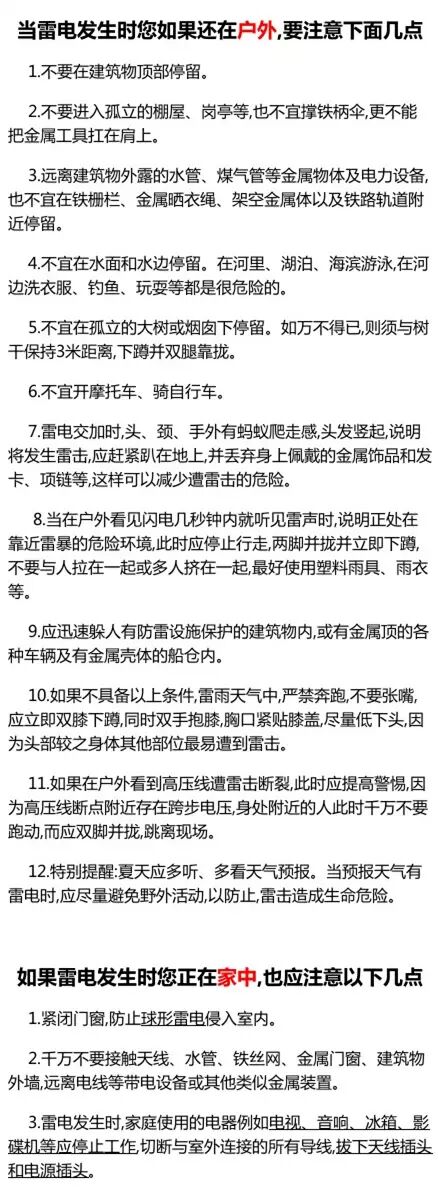 若在野外无处躲避时,最好双脚并拢下蹲,并舍弃随身携带的金属物件,切记!切记!切记!!千万别用手机打电话!!!