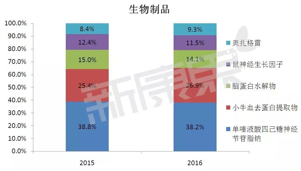 生物制品市场集中度非常高,前四产品合计份额超90%。排名榜首的是单唾液酸四己糖神经节苷脂钠,份额接近40%,小牛血去蛋白提取物以25%以上的市场占比紧随其后。