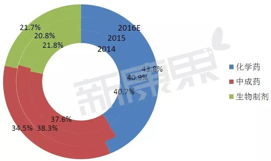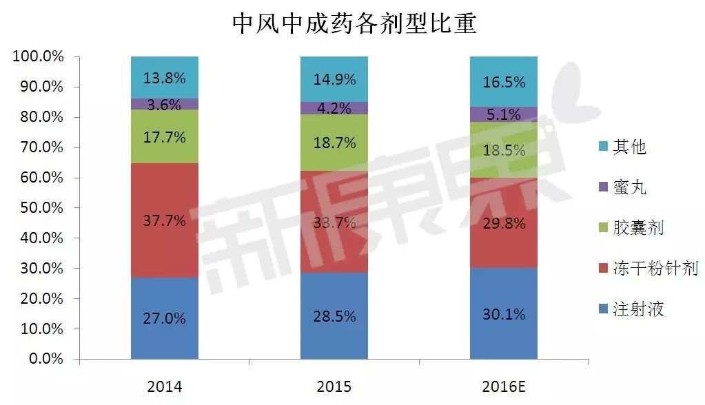 据中康CMH监测数据显示,中风用药市场以化学药占比最大,2015年市场份额为40.9%,预计2016年上升至43.8%。中风中成药中,注射剂占据较大比重,而中药注射剂是辅助用药新政的重点监控对象和限制使用对象,受这一政策影响,预计中风中成药市场份额将由2015年的38.3%下降至2016年的34.5%。