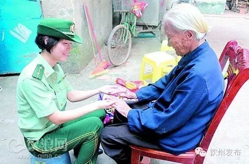 7、钦州边检官兵重阳节看望百岁老人 在“九九重阳节”即将到来之际,钦州边防检查站官兵深入驻地走访慰问百岁老人黄三姐,给老人带去了诚挚的问候和重阳节的美好祝福。