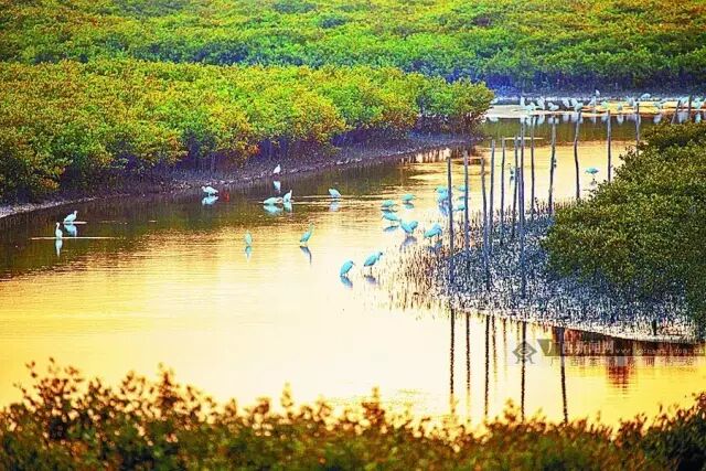 红头潜鸭、小䴙䴘、信天翁、鸬鹚、白鹭、青蛙、蛇、水獭“演奏”出一首湿地交响乐;红树林茂盛高大的肢体宛如一道道绿色长城,抵御狂风恶浪和海啸……