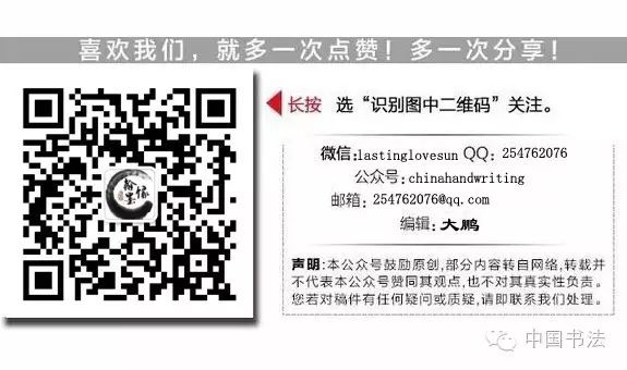 为了让更多的人有机会欣赏和收藏名家作品,中国书法微信平台每周日推出各类艺术家的优秀的作品,以满足普通大众“亲近艺术、感悟生活”的需求!欢迎大家关注本微信公众号中国书法(微信号:chinahandwriting):中国最专业的书画艺术品收藏学习、交流、交易平台,互相讨论学习。