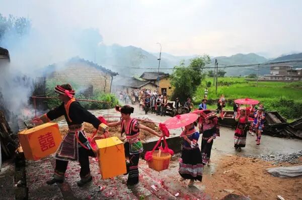在告别父母时,要连哭三声,表示惜别;在门槛连踏三次,表示依依不舍;然后由族内兄长背出村寨门楼,和伴娘一起步行回夫家。