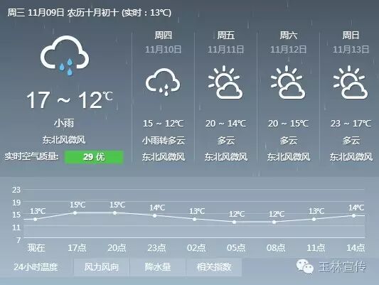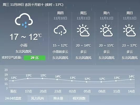 11月10日,全市阴天有小雨,最低气温10℃~13℃,最高气温14℃~15℃。