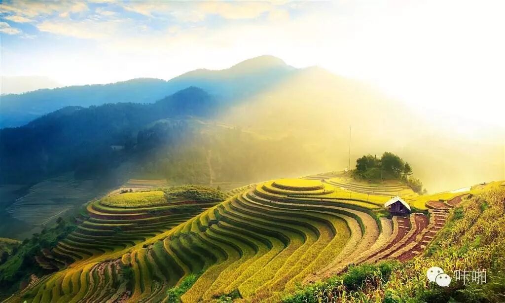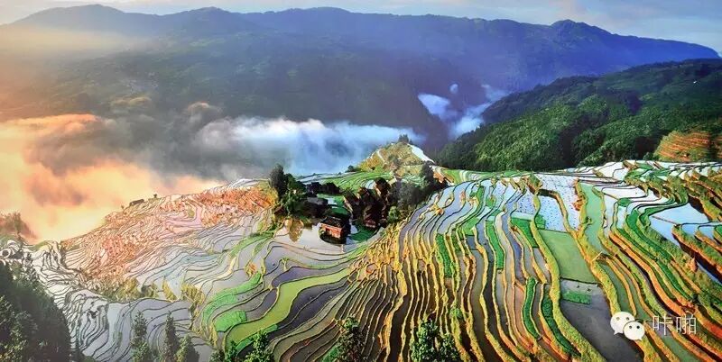 梯田最吸引人的地方莫过于它美丽的造型以及在瞬息万变的光线中呈现出的不同色彩。镜头中的梯田宛如一支万花筒,每天、每个时刻都幻化出不同的色彩和姿态。