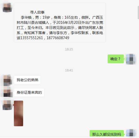 据爆料者称,李华焕于去年的年3月20日,远赴他乡到广东东莞工作,在这一年期间,该男子于2016年下半年期间少联系家人,到了2017过年的时候,该男子还是不见回家过年,也没有与家人联系。
