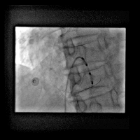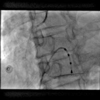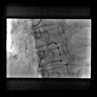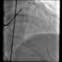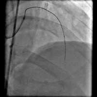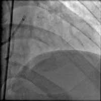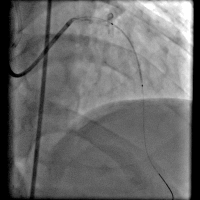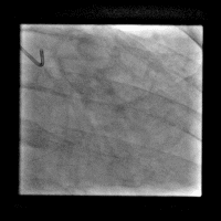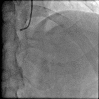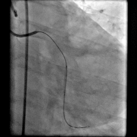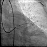 手术过程(一): 将Runthrough NS 0.014″×180 cm导丝通过右冠病变放到右冠脉后降支远端,沿导丝送入抽吸导管反复抽吸。