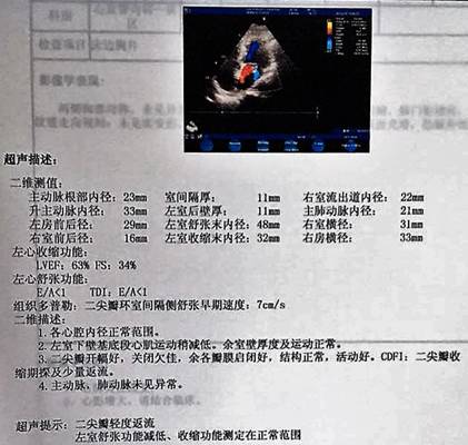 彩色超声诊断报告(一): 二尖瓣轻度反流、左室舒张功能减低、收缩功能测定在正常范围内。