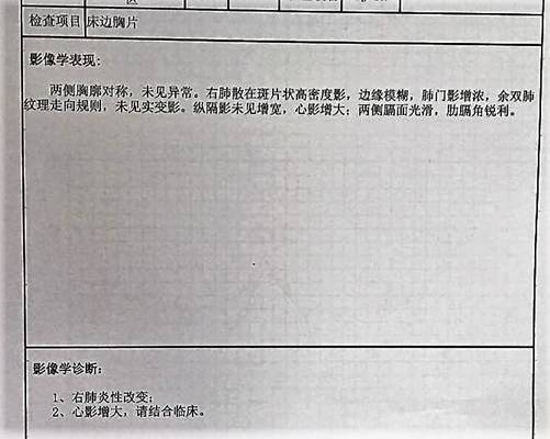 彩色超声诊断报告(二): 右肺炎性改变、心影增大。