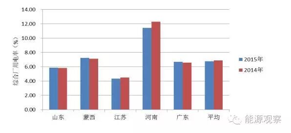 从山东、蒙西、江苏、河南、广东五个重点省份(重点省份选取该类型机组发电量排序前5名省份,下同。)看,2015年平均综合厂用电率为6.76%,同比下降1.72%。其中河南最高,为11.41%,江苏最低,为4.34%。详见图1-1。