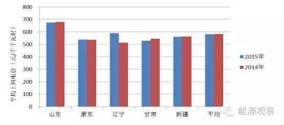 从蒙东、山东、甘肃、辽宁、新疆五个重点省份(地区)看,2015年平均上网电价为580.21元/千千瓦时,同比下降0.66%,其中山东最高,为674.26元/千千瓦时,甘肃最低,为529.78元/千千瓦时。详见图2-3。