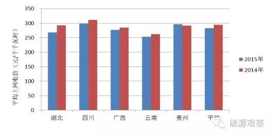 从四川、湖北、云南、贵州、广西五个重点省份看,2015年平均上网电价为282.15元/千千瓦时,同比下降4.16%,其中四川最高,为298.14元/千千瓦时,云南最低,为252.94元/千千瓦时。详见图2-2。