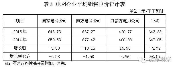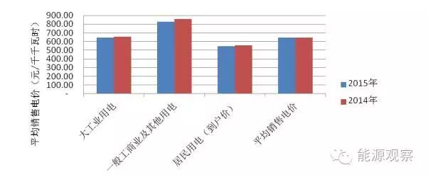 2015年,电网企业平均销售电价为643.33元/千千瓦时,同比下降0.57%。