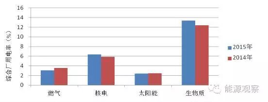 2015年,全国发电企业平均综合厂用电率为5.90%,同比下降0.60%。其中,生物质发电最高,为13.37%,水力发电最低,为1.71%。