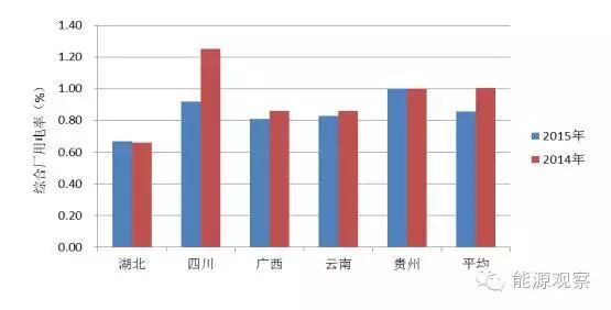 从四川、湖北、云南、贵州、广西五个重点省份看,2015年平均综合厂用电率为0.86%,同比下降14.80%。其中贵州最高,为1%,湖北最低,为0.67%。详见图1-2。