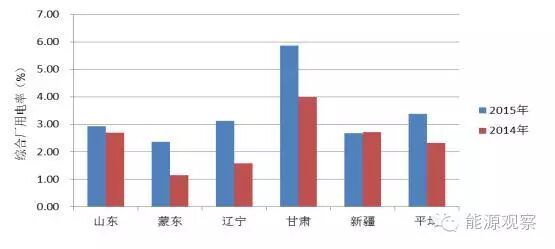 从蒙东、山东、甘肃、辽宁、新疆五个重点省份(地区)看,2015年平均综合厂用电率为3.39%,同比增长46.07%。其中甘肃最高,为5.87%,蒙东最低,为2.37%。详见图1-3。