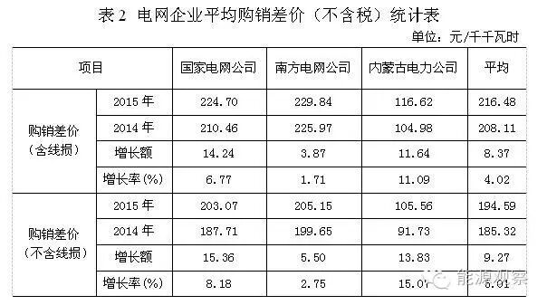 2015年,电网企业平均购销差价(含线损)为216.48元/千千瓦时,同比增长4.02%;扣除线损,电网企业平均购销差价为194.59元/千千瓦时,同比增长5.01%。