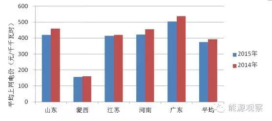 从山东、蒙西、江苏、河南、广东五个重点省份看,2015年平均上网电价为376.02元/千千瓦时,同比下降4.34%。其中广东最高,为504.76元/千千瓦时,蒙西最低,为157.32元/千千瓦时。详见图2-1。