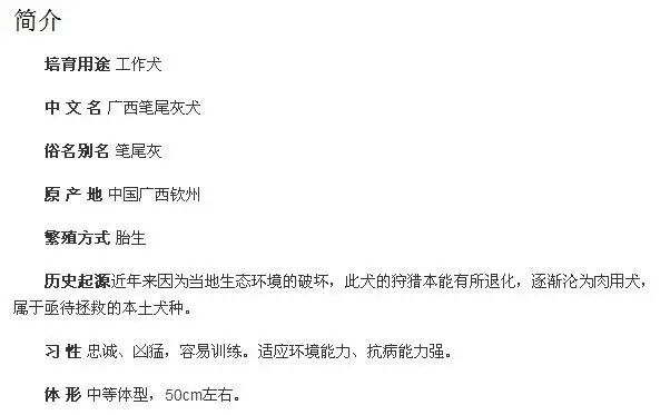 早前小编咨询了钦州一位兽医,他说:由于人们生活习惯和自然环境的改变,加上缺少规范的养殖和培训,钦州的纯种笔尾灰估计几乎绝种,剩下的可能可能是不知多少代杂交的“本地狗”了。当然,其实狗和动物是人类的忠诚朋友,不管它是不是纯种,只能你善待它们,它们也会忠诚待你。