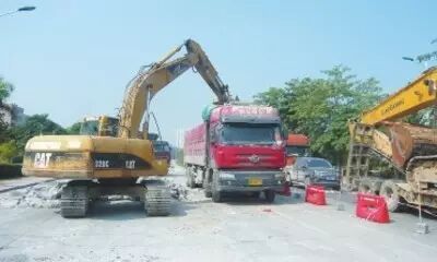 关于北流标段,同样是半封闭施工,期间虽然车来车往,施工现场一片忙碌,但已用隔离带将施工路段隔离,把部分坑洼路面捣碎,挖掘机和运输车辆来回穿梭,运走捣碎的混凝土,各项工作还是有序进行。