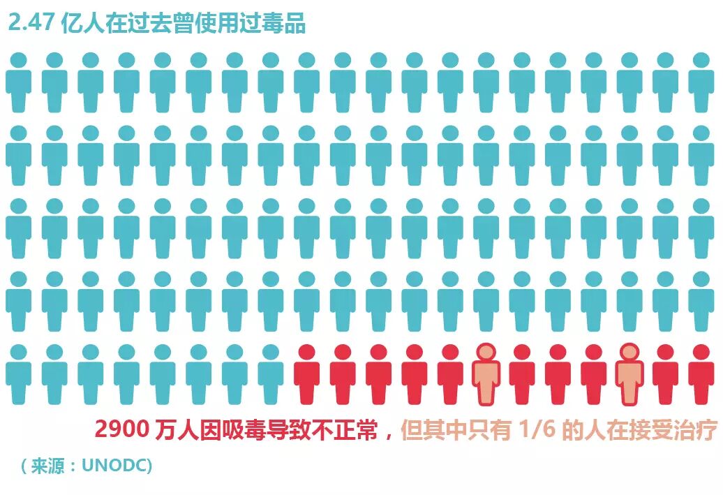 ,根据2014年统计,全世界15到64岁的人有10亿,其中约2.5亿人使用过至少一次毒品。这个数字几乎相当于法国、德国、意大利和英国人口的总和。因使用毒品而不正常的人共计2900万,比之前的报告数字多了两百万。