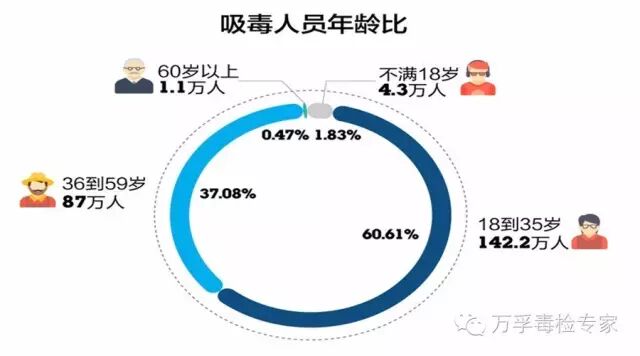 我国的“”呈现出低龄化特征突出。234.5万名吸毒人员中,不满18岁的有4.3万名;18岁到35岁的有142.2万名;36岁到59岁的有87万名;60岁以上的有1.1万名。男性吸毒者数量远超女性