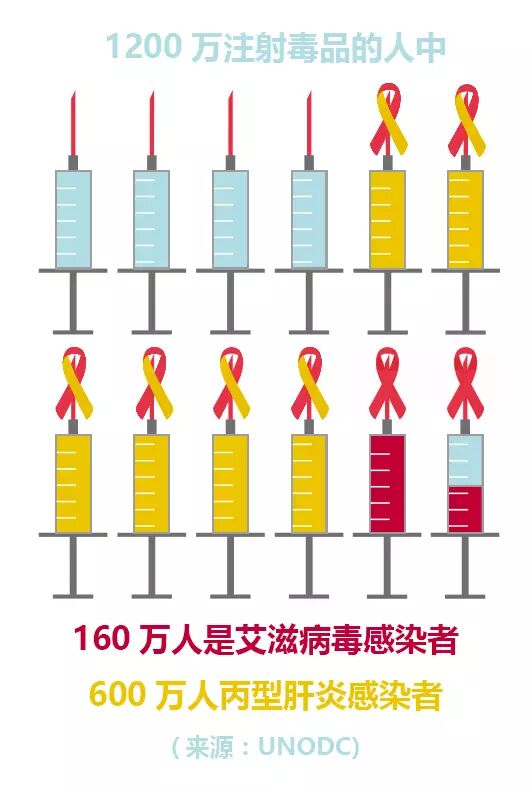 据统计,在全球1200万注射毒品的人中,,600万人感染丙型肝炎。 除了注射带来的疾病,报告还重点提出,过去两年在北美、西欧和中欧地区,因为使用或相关的毒品过量,,出现大幅增长。美国使用的人数在2014年比2013增加了将近三倍,,增加了五倍。