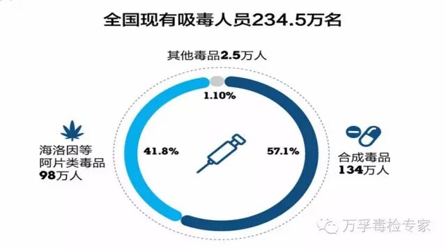 ,截至2015年底,全国有吸毒人员234.5万名(不含戒断三年未发现复吸人数、,大约占全国人口的2‰。也就是说,每500人中就有一名毒品的“”。其中,滥用等阿片类毒品的有98万人;滥用合成毒品的有134万人;滥用其他毒品人员大约2.5万人。