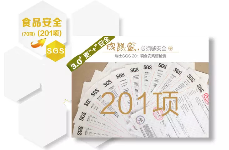 每一款蜂蜜均通过SGS高达201项食品安全检测,其中包含182项农药残留,7项抗生素残留,2项重金属残留。我们还特别检测了蜂蜜中的主要养生物质:总黄酮和SOD酶。