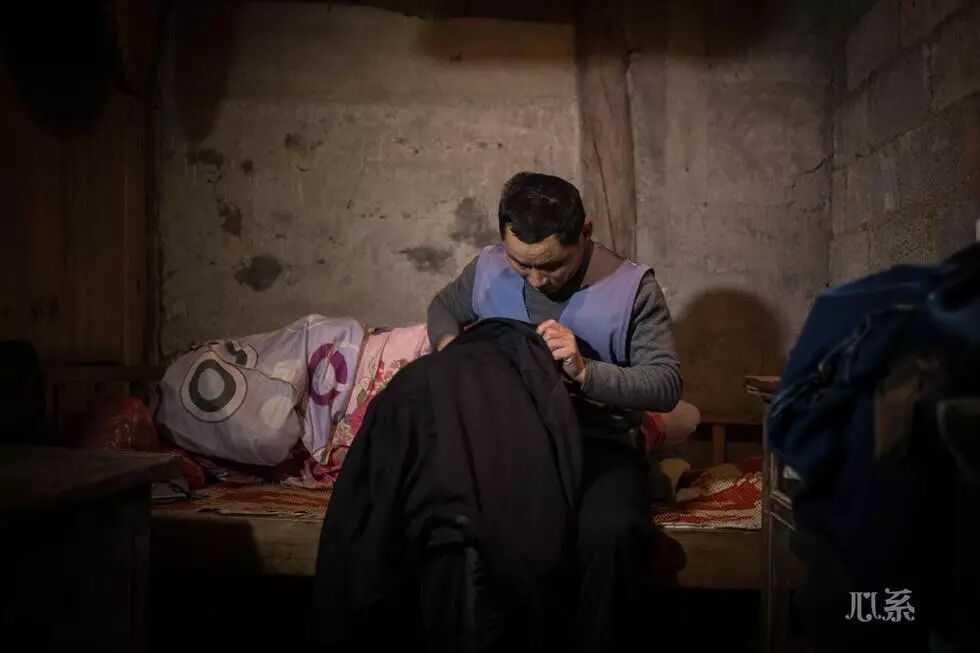 两年前,儿子打工回家,拿着仅有的存款带父亲去医院看病,给右眼做了手术。恢复期间,为了补贴家用,何可春在邻村找了一份零工,帮别人盖房当小工。