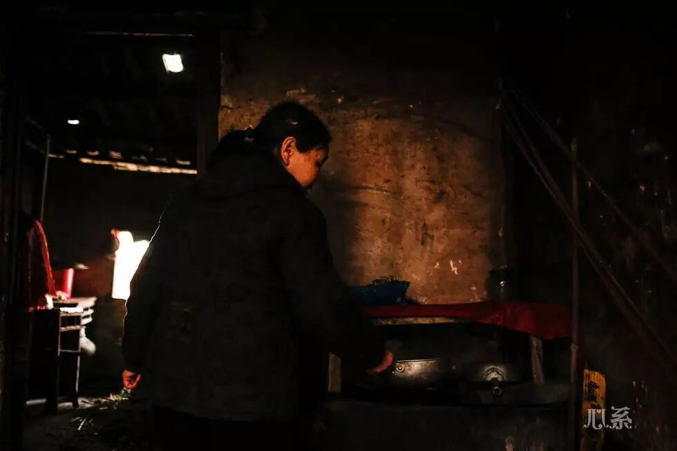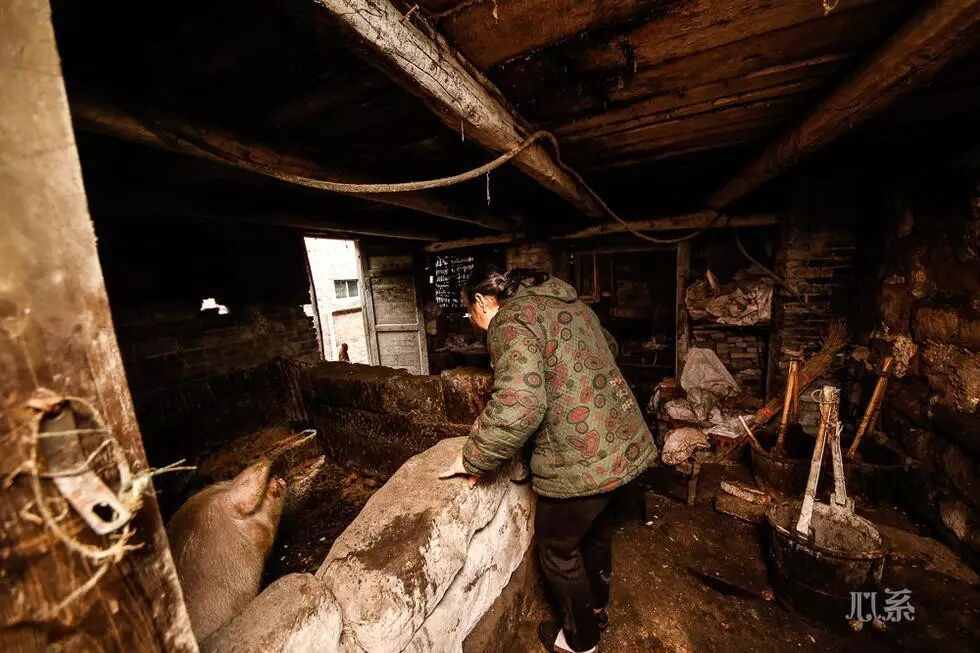 她将自己事先煮好的猪食搅拌,一点点舀斤猪圈的石槽里,由于右眼看不见,流在外面的猪食,让猪儿乱拱一气。