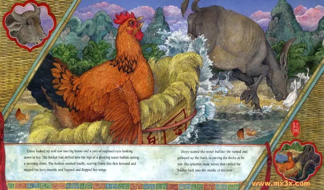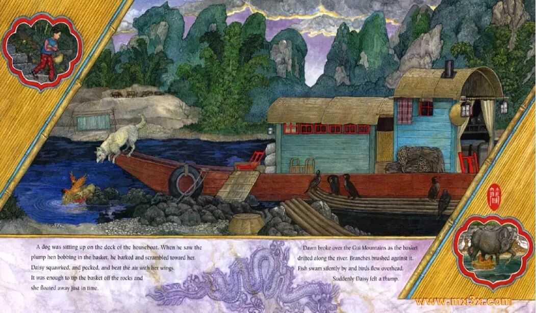 一只狗正坐在船屋的甲板上。当他看到篮筐中不断晃动的胖母鸡时,一边吼叫着一边向她扑过去。芦花咯咯叫起来,用嘴啄着,翅膀在空中拍打着。这样一来,就足以让篮筐离开岩石,及时漂走了。当篮筐继续向前漂流时,桂林山上迎来了黎明的破晓。树枝轻拂着篮筐,鱼儿在它身旁安静地游过,鸟儿在它头上掠过。