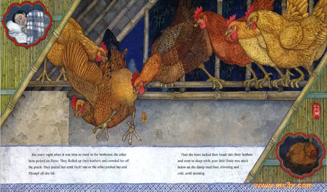 然而,每天晚上,当母鸡们都回鸡窝休息时,其他母鸡都跟芦花过不去,故意作弄她。她们用翅膀拍打她,要把她挤下栖木。她们不停地推搡,用嘴啄,砰!芦花最终被挤了下来,摔倒在地。