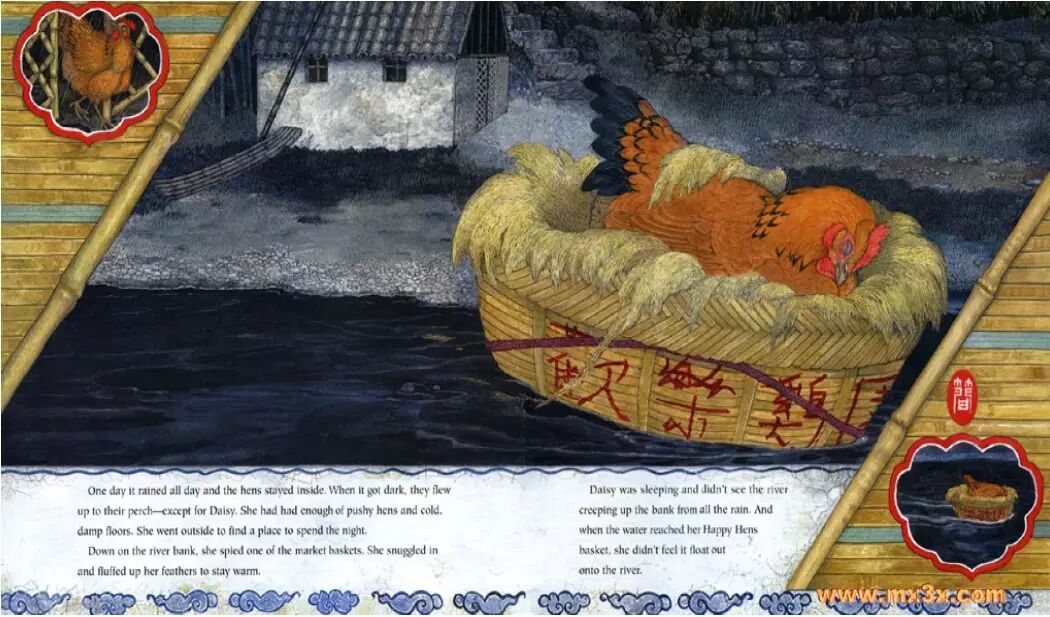 “那是我的母鸡!”她对渔夫喊道。但是那个渔夫看起来无动于衷。小梅指着篮筐上的红字说“欢乐鸡园。”渔夫双手交叉说道:“谁捡到就是谁的!”他吼道,然后转身继续卖芦花。