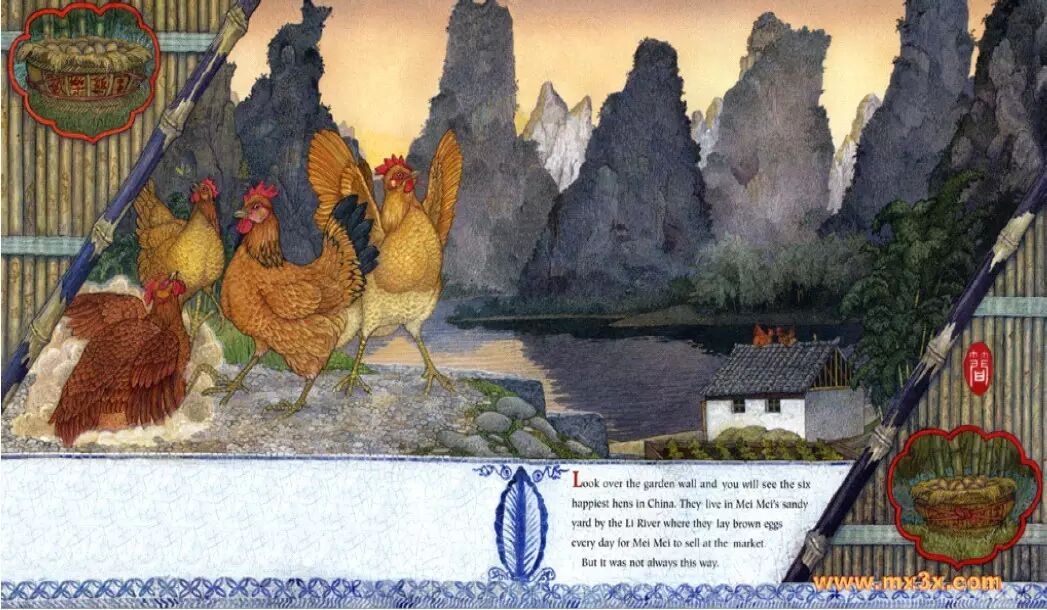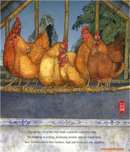 从花园的围墙望过去,你能看到六只快乐的母鸡。她们就住在漓江边小梅家的院子里。她们每天都下蛋,好让小梅拿到集市上去卖。