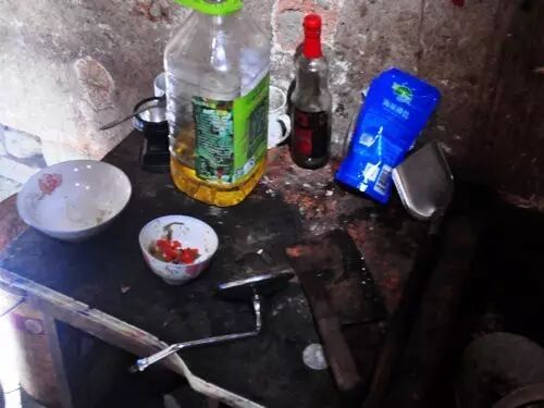 一把生着铁锈的菜刀,一把乡下旧时常见的烧水铜壶,一口小铁锅和一口废弃的大锅,还有两只满布灰尘的饭炉,数十口泥砖在地上垒成的一个临时火炉,上面支着一个用来搁放铁锅或水壶的铁架,厨房里的这些,就是她们平时用来烧饭做菜的可用之物。