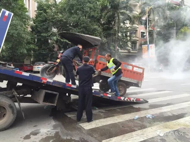 2月23日下午,由多部门组成的综合执法队在开展文明交通专项整治过程中,查扣一辆涉嫌非法营运的违规机动三轮车,该车主抵抗执法,并用打火机点燃机动车油箱,车辆随即起火。为避免发生油箱爆炸等危险,保护周围群众安全,执法人员不顾个人安危,第一时间取来灭火器灭火,并立即将歹徒制服。。来源公众号:广西东兴