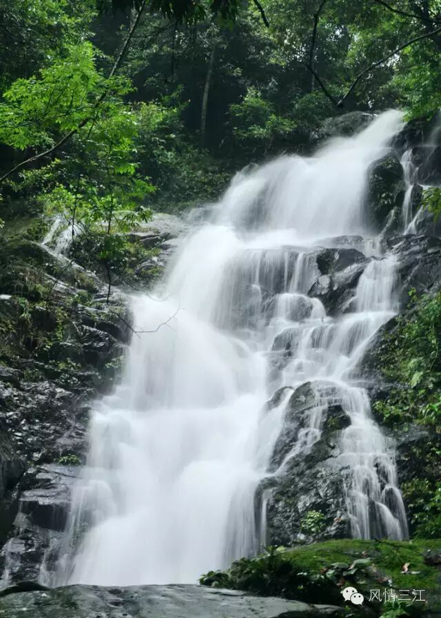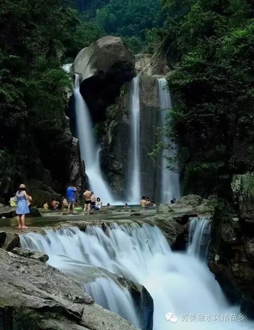 三友瀑布,因其有三道瀑流从落差约20米的山头飞流直下而得名。瀑顶两旁树木苍翠繁茂,巨石直立陡峭,三道白色的水帘,像三条仙女轻抛的白玉缎带,挥舞着天地间的灵气,幽幽从天际飘落下来,在这里,你可以在瀑下清潭畅游,抑或来一次惊险刺激的瀑降,又或者坐在清凉石头上,赏着绿水青山,看那嬉笑游人。