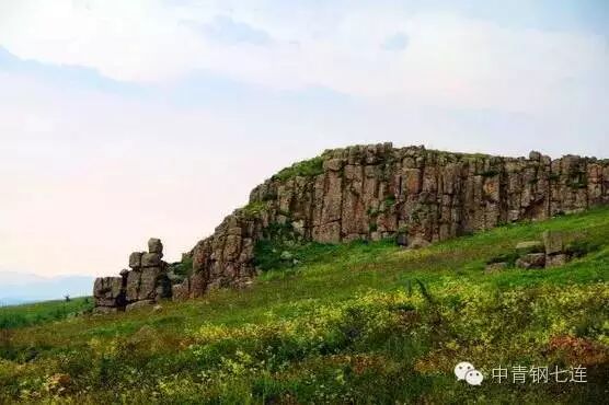 阎片山的岩石的形状很特别,是紧密排列又上下断裂了的巨大石柱群。很突兀地矗立在草原天路一侧平缓浑圆的丘陵中,是鬼斧神工般的石头奇景。旅者大多就此停车或者露营,欣赏鬼斧神工般的石头奇景。山不高,但也需要手脚并用,才可以爬上山的顶峰,远处看,像是远古巨人造就的几组相互守望的石头城堡。
