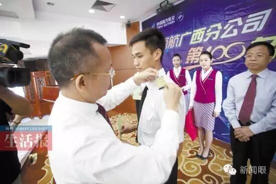 11月4日,南航广西分公司举办了2016年第100名机长首聘仪式。3名飞行员经过论文答辩、案例分析、评委提问和评议等环节,晋升为波音737系列飞机机长,仪式上,南航广西分公司党委书记为第100名机长——韦苇颁发了聘书,并为他戴上了象征荣誉与责任的“四道杠”机长肩牌。3名机长紧握右手,进行了庄严的宣誓。至此南航广西分公司机长总人数突破100人。