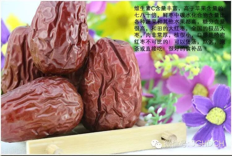 红枣营养十分丰富。维生素C含量在水果中名列前茅,每百克含量达0.1~0.6克,比苹果、桃子等高100倍左右,维生素P的含量也是百果之冠,人们称赞枣是“天然的维生素丸”。人们历来就把红枣视为极佳的滋补品。红枣不但是美味果品,还是滋补良药,有强筋壮骨、补血行气、滋颐润颜之功效。
